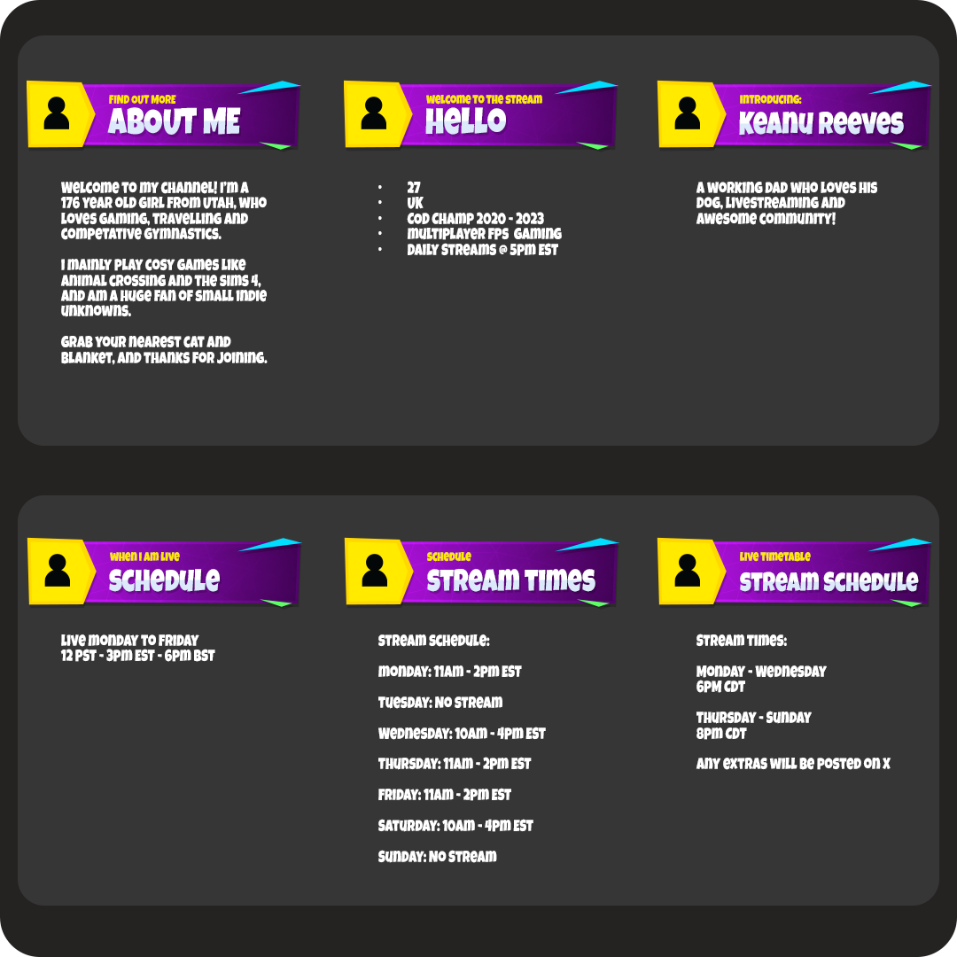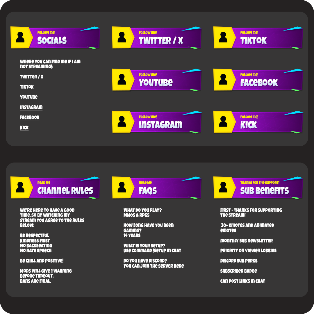 Twitch Panels are customisable Twitch graphics that contain information about you, your social media links, your sponsors, your donation links, schedule, stream rules and more.