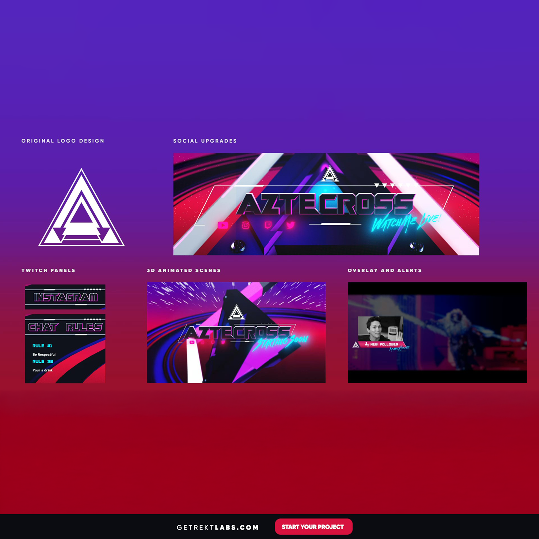 GETREKT Labs features custom stream overlays, animated Twitch overlays, interactive stream assets, 3D world building, Unreal Engine 5 environments, custom widgets, stream overlays for OBS, camera overlays, reactive overlays, emotes, alerts, sound effects (sfx), set-up, coding and more for all items. Set-up includes all platforms and integration with StreamLabs, Stream Elements and OBS.